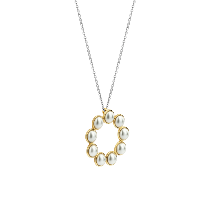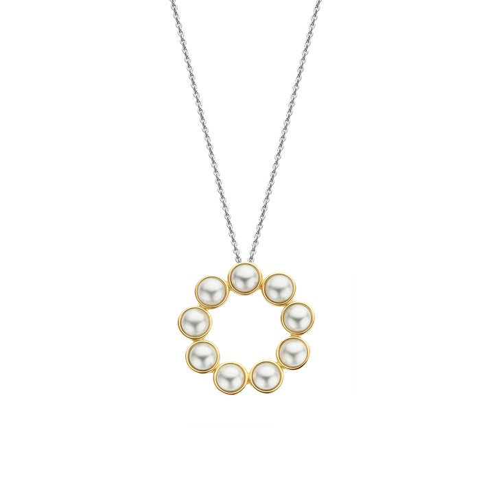 Questa collana d’argento placcata oro TI SENTO attira ogni sguardo con la sua struttura circolare di perle incastonate a mano in una montatura placcata oro. È realizzata in argento sterling 925 e placcata oro giallo.